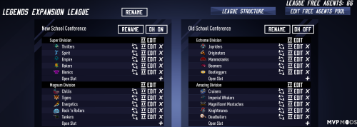 This league includes the 8 default Legends teams (and Free Agents), and an additional 12 teams based on real Historical players, for a total of 20 teams in the league. The teams are roughly from these time periods and/or settings.